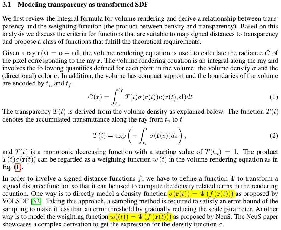 | SDF to volume density 과정을 모델링한 논문들을 살펴 보면, SDF to volume density로 바로 가는 VOLSDF 같은 류가 있고, SDF to weight to volume density로 한단계 거쳐 가는 NeuS 같은 류가 있다. 성능 측면에서 NeuS가 압도적이었기 때문에 후자를 정설로 여기면서 사용해왔었다. |
