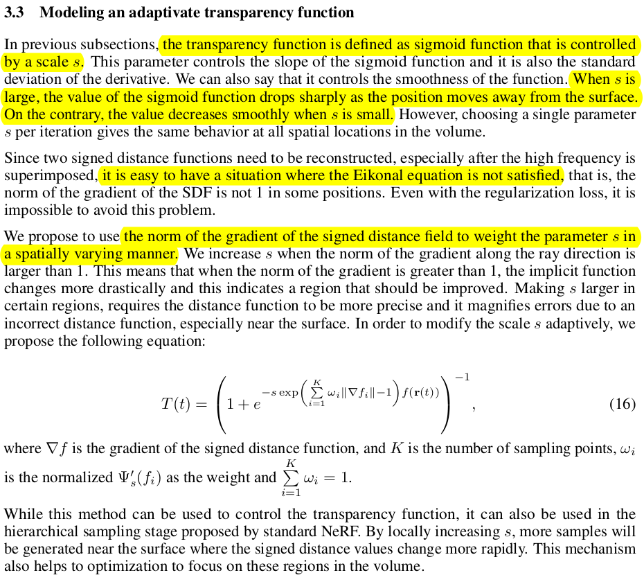 | SDF to transparency를 수식(6)과 같이 쓰려다가 관찰해보니, high frequency detail을 잡으려고 노력하다보니 eikonal equation이 깨질 때가 빈번한데 eikonal loss로 학습하다보니 효과가 줄어들어 eikonal equation이 깨질 때 오히려 loss가 방해가 되는 일을 없애기 위해 약간의 수정을 했다고 한다. 그냥 기존 수식의 계수에 norm of gradient의 크기를 보고 1보다 크면 implicit function 변화가 크도록 기울기를 가파르게, 1보다 작으면 implicit function 변화가 작도록 기울기를 완만하게 바꾸는 값을 곱해주었다. |