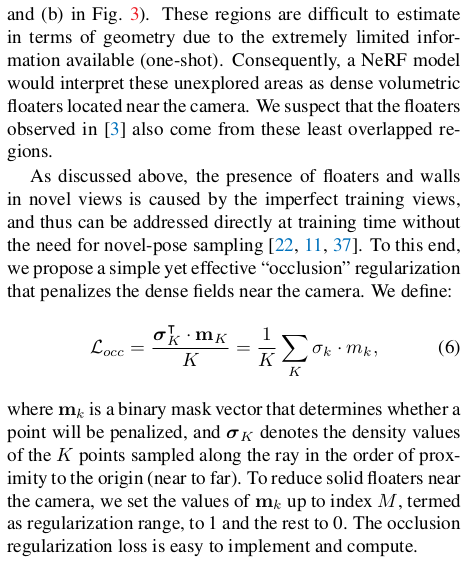 ![]() 또 하나 적은 수의 이미지로 학습시킬 때 문제가 구름처럼 떠있는 floater가 많다는 것인데, 이것의 원인을 분석해보면 대부분 화각이 많이 안겹치는 것이다. 즉, 이미지에서 많이 안 보인 영역이어서 네트워크가 미지의 영역으로 보고 쓰레기값으로 채워두고 마는 것이다. occlusion penalty는 카메라에 가까운, 카메라 코 앞 영역은 화각이 안 겹칠 확률이 높으므로 이 영역에서 sampling된 point들은 높은 density를 못 갖도록 억제하는 기능을 한다. 초반 M개의 ray sampling point를 죽이고, 나머지를 살린다. |