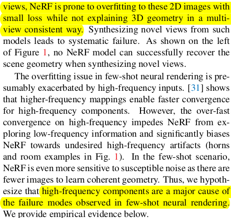 (preliminaries 는 NeRF 수식 설명이므로 생략) NeRF를 적은 수의 이미지로 학습시켜보면 overfitting이 쉽게 되어 실패하는 경우가 많은데, 그 원인을 찾아보면 high frequency encoding값들이었다. (다른 논문에서도 그렇지만 학습 초기에 low frequency에 집중하도록 하는게 좋다고 하는데 같은 맥락인 듯. 심지어 적은 수 이미지인데 high frequency가 그대로 있으면 학습이 더 안된다는 뜻) |