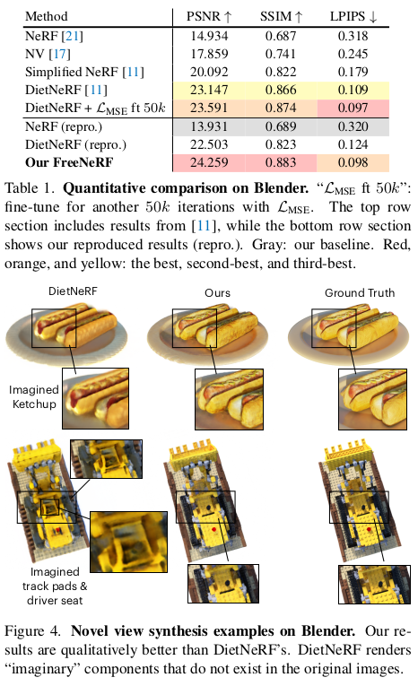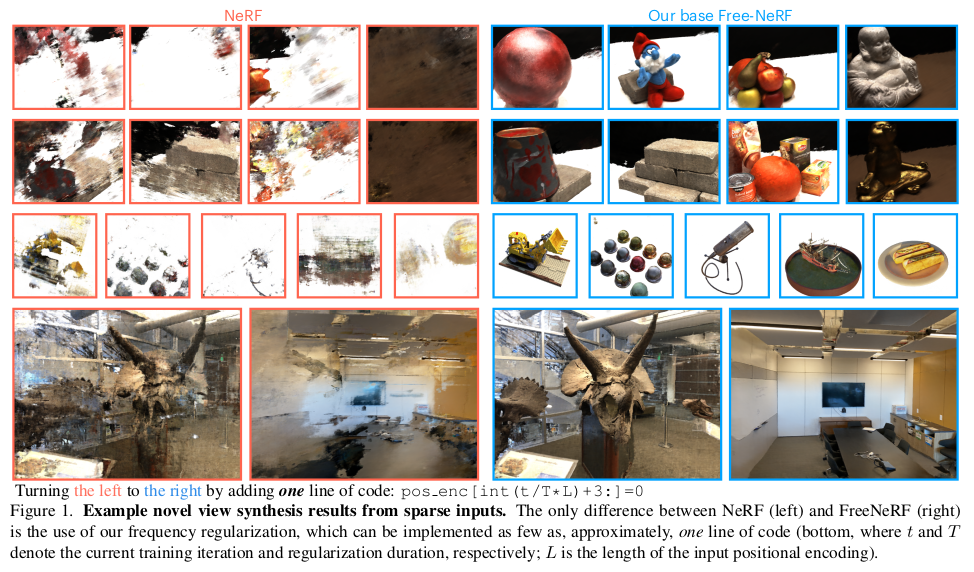 Free라고 해서 뭐가 Free인가 했더니 Frequency의 Fre-e 였다. 요점은 frequency range를 제한하고 카메라에 가까운 위치, 즉, 카메라 코 앞 영역에서 density 값을 높게 추정하지 않도록 패널티를 주는 것이다. 결과적으로 학습 효율성이 엄청나게 증대되기 때문에 적은 이미지로도 학습이 가능한 NeRF가 된다고 한다. 또, 힘주어 강조하는 점은 구현 상으로 한 줄 추가하는 것 뿐이라는 사실이다.