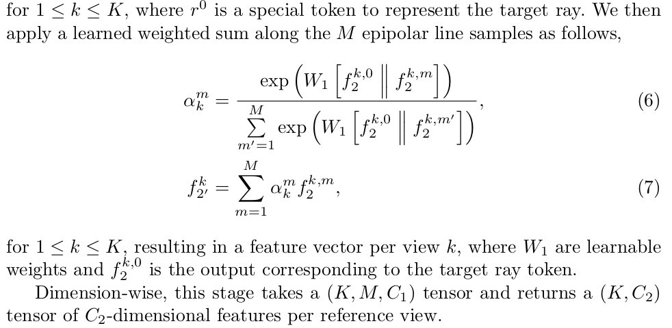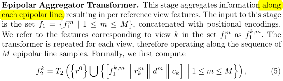 | 두번째 transformer, epipolar aggregator transformer는 한 view에 대해서 epipolar line 상 aggregation을 담당한다. line 1개 단위로 합치는 셈이다. aggregation 시 weighting 을 담당하는 녀석은 learnable이다. |