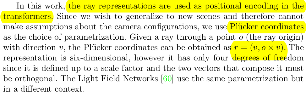 | Light field가 어떻고 저떻고 써있는데 결국은 ray를 어떻게 표현할지 그 표현법을 말한다. 독특하게 plucker coordinate을 사용해서 ray representation을 사용했는데 내 경험에 의하면 이 표현법이 ray 간의 거리나 각도 계산이 편했던 것 같다. Light Field Neural Rendering 이 글에 위에 말한 light slab이나 two sphere가 무엇을 뜻하는지 적어두었다. |