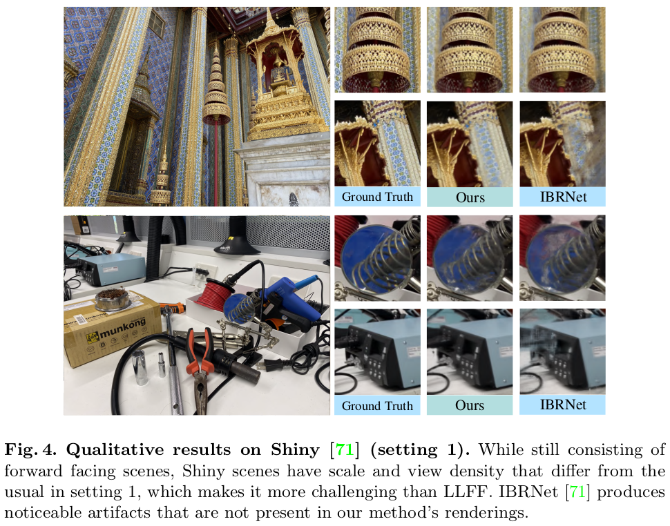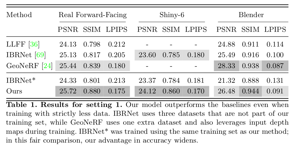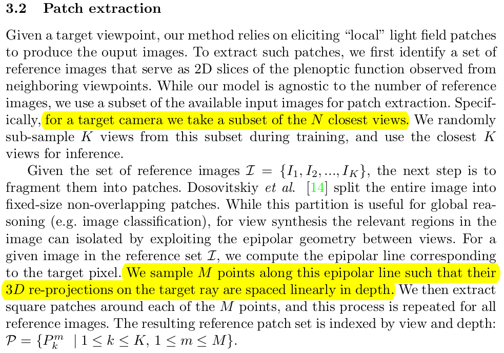 | 글이 길지만 핵심은 epipolar line 상에서 patch를 떼어내서 가지고 있는데 이를 효과적으로 다루기 위해선 self-attention과 cross-attention을 갖고 있는 transformer 구조가 제 격이란 말이다. 총 3개의 transformer로 구성되어 있으며, line 간, line 별 attention 하는 느낌이다. 추가적으로 color를 feature에서 prediction하는 것이 아니라 reference view들에서 떼어와서 만들도록 함으로써 네트워크가 scene을 더 잘 배우도록 유도한다. |