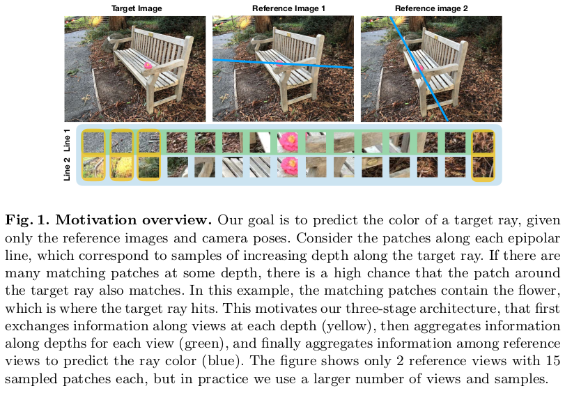 제목만 보고 NeuralWarp 처럼 patch 단위로 color loss를 매기는 논문인 줄 알았는데 조금 느낌이 다르다. NeRF 류 중에 generalization을 목적으로 하는 논문들은 대부분 deep feature에 의존한다. 이미지에서 feature를 추출하고 feature에서 시작하는 NeRF다. 하지만 이 논문은 generalization의 관점을 바꾸어서, 네트워크에게 실제 이미지를 어떻게 조합해서 NeRF를 학습해야 하는지 그 방법을 알려주어 해결하려고 한다. feature에 모든게 담기길 원하는 것이 아니라 실제 입력 이미지에서 patch를 떼어온 다음 patch를 사용하는 방법을 네트워크에게 학습시킨다.