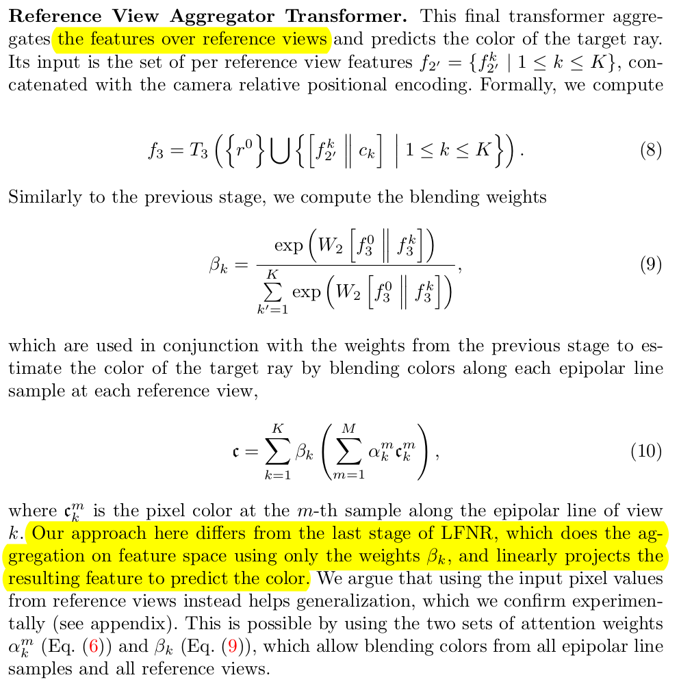 | 세번째 transformer는 reference view aggregator transformer로, 역시 epipolar line "간" aggregation인데 첫번째 transformer와 다르게 point 레벨이 아닌 line 전체 레벨에서 aggregation한다. 이 때 역시 weighting을 담당하는 녀석은 learnable이며 앞서 두번째 learnable weight와 같이 조합된다. (point 레벨 weight * line 레벨 weight 이므로 어떤 line의 어떤 point가 중요한지 가리키게 됨) 그 weight로 원본 referece image들의 color를 떼어와서 합치면 rendering color가 돼야 한다. |