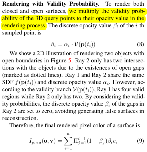 SDF 를 그대로 사용하되 validty 확률을 평가하는 부분이 추가되어있고, SDF의 부호를 조정하는 부분이 추가되었다. SDF 부호를 조정하는 부분은 SDF to volume density 수식에 해당하는 부분인데 조정 시에 수식이 유지해야 할 unbiased weight나 occlusion-aware 성질을 그대로 보존하는 것이 핵심이다.