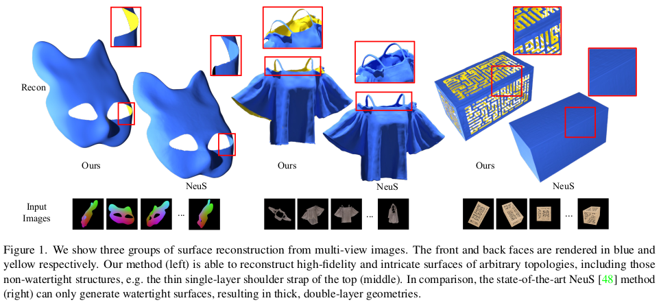기존 3D surface recontruction 알고리즘이 SDF를 사용하기 때문에 내부, 외부 구분이 확실한 물체 복원에 특화된 형태였다. 실제 물체는 항상 watertight 형태가 아니라 내부, 외부 구분이 어려운 마스크나 옷, 뚫린 구조물 등이 많은데 이를 커버하는 것이 목적인 논문이다.