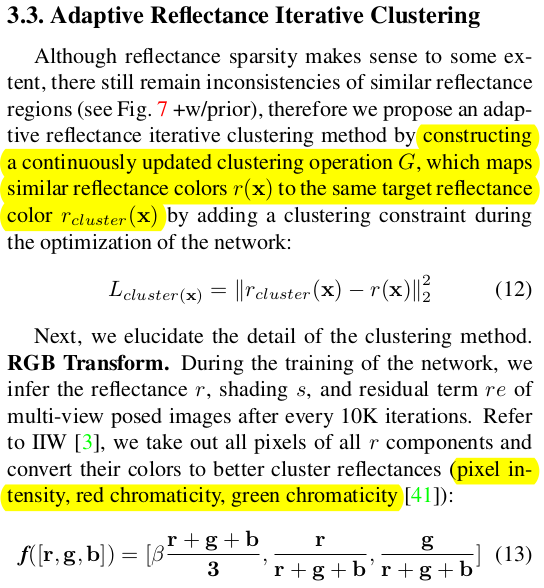 다짜고짜 loss를 설명한다. 여기서 x, y는 3D point 아니고 2D point라는 것을 명심하자. 2D point라고 이해했을 때 뭔가 이상하다면 해당 ray를 따라 모두 aggregation하는 경우라고 해석하면 된다. 이미지 내 영역이 비슷해보이면 r, s도 비슷할 것이란 가정을 이용하기 위해 이미지 pixel 간의 similarity 같은 개념을 정의해야 했다. 그래서 정의한 것이 chromaticity다. 뭐 대충 intensity와 상관없는 색감 같은 느낌인데 pixel color를 normalization한 것이다. 이게 (grayscale shading assumption인 듯, 회색이 intensity니까) 주의할 점은 여기서 저 c(x)가 r*s+re 가 아니라는 것이다. (ch로 쓰던가) Chromaticity prior는 이미지 pixel에서 얻은 chromacity와 네트워크 output으로 만든 reflectance가 갖도록 loss를 거는 것이다 논문이 거지 같은데 c_r == reflectance 이다. 개념 상 reflectance가 색감, shading이 intensity, residual이 자투리이므로 reflectance가 c(x)를 닮도록 유지해야 reflectance가 이미지를 보고 색감을 잘 찾는다는 것이다. (이걸 저 한 줄만 읽고 어떻게 알아) reflectance sparsity(검색해도 뜻 안 나옴)는 대충 인접 픽셀 끼리는 chromaticity가 비슷하면 reflectance가 같다는 loss다. 여기서 chromaticity는 입력 이미지 pixel color로 만든 것, r은 네트워크 출력이다. (사실 상 c랑 r 개념이 같은 것인데 하나는 이미지, 하나는 네트워크에서 나온 것이라고 생각하는게 이해하기 편하다.) |