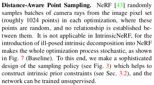 ![]() (사실 여기서부터 맘에 안들었다. Sec 3.1인데 이해하려면 Sec 3.2와 저 맨뒤에 Fig.7에 다녀와야 한다는게... 이럴거면 뒤에 쓰지) point sampling이라고 써서 이게 ray를 상에 point를 뽑는다는건지 ray를 만들 때 어떤 이미지 pixel을 쓴다는건지 헷갈리는데 후자다. NeRF에서 ray 1024를 batch로 쓰는데 무작위 선별이다. 하지만 IntrinsicNeRF는 이미지 내 영역이 비슷해보면 reflectance, shading도 비슷할 것이라는 가정을 쓰기 때문에 애초에 ray를 뽑을 때도 rule 기반으로 뽑아야 한다는 얘기 (근데 이거 Sec3.2안 보면 이해못함 ㅋㅋ) |