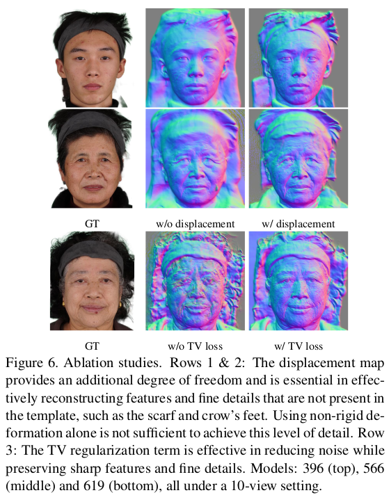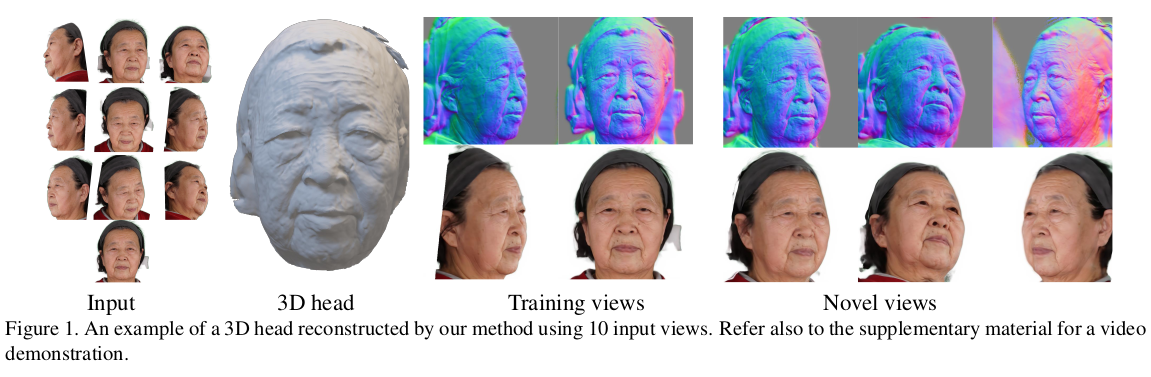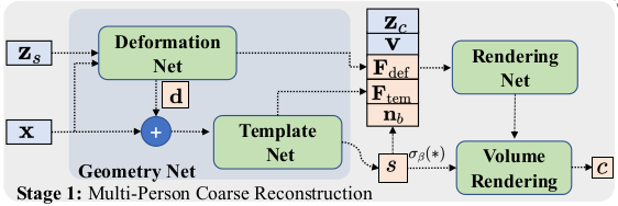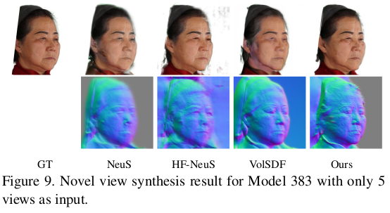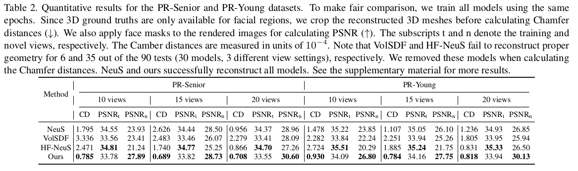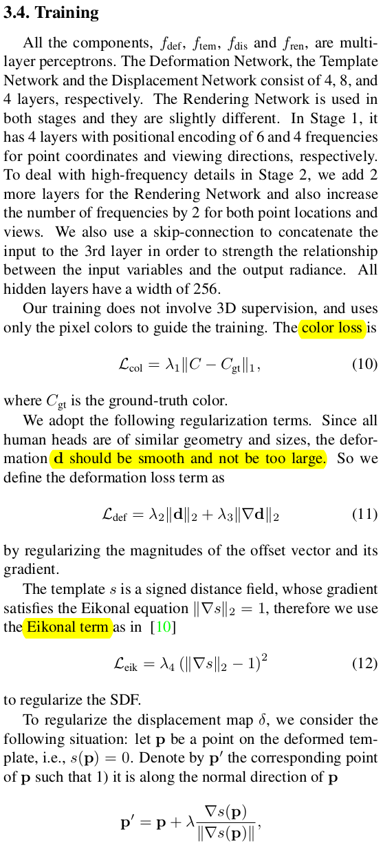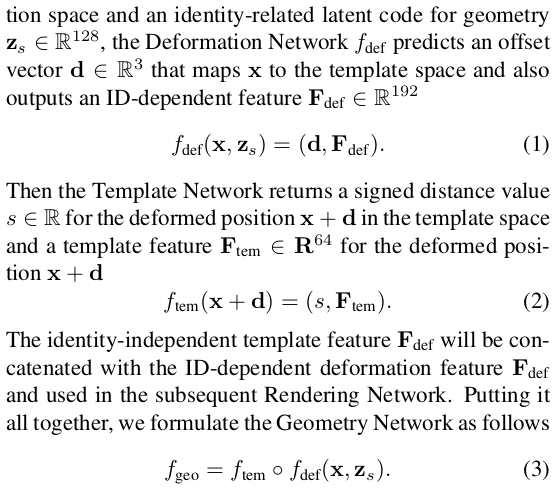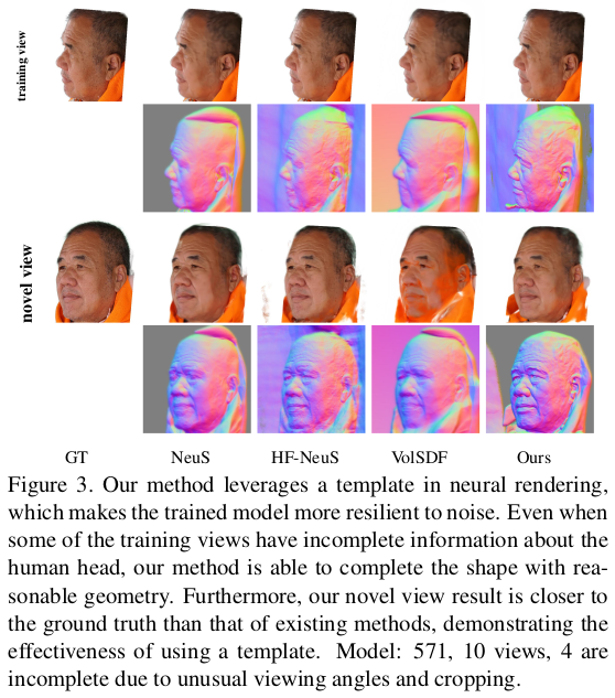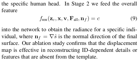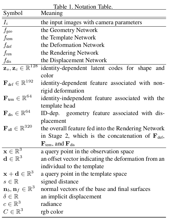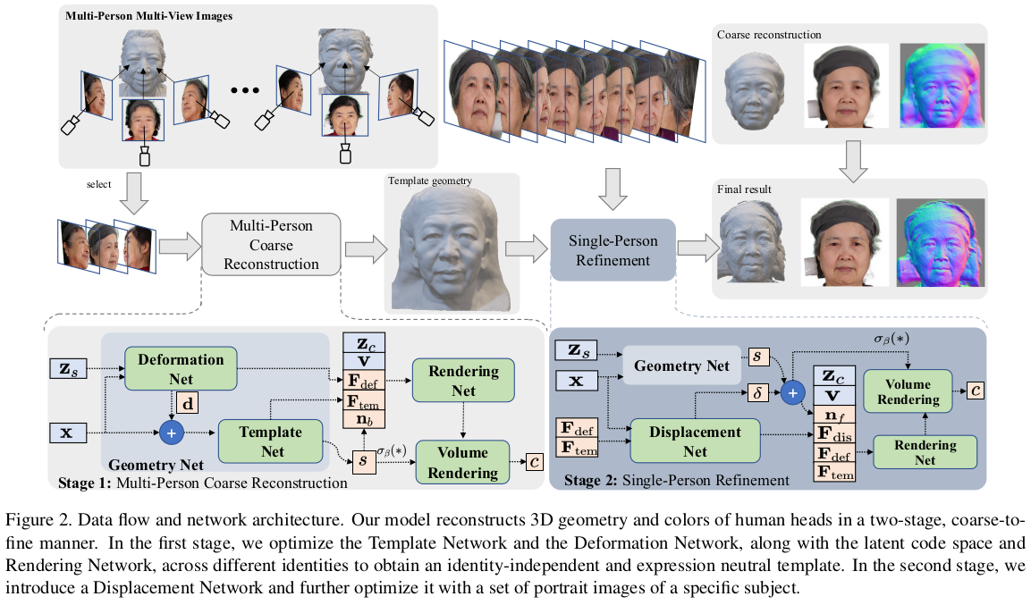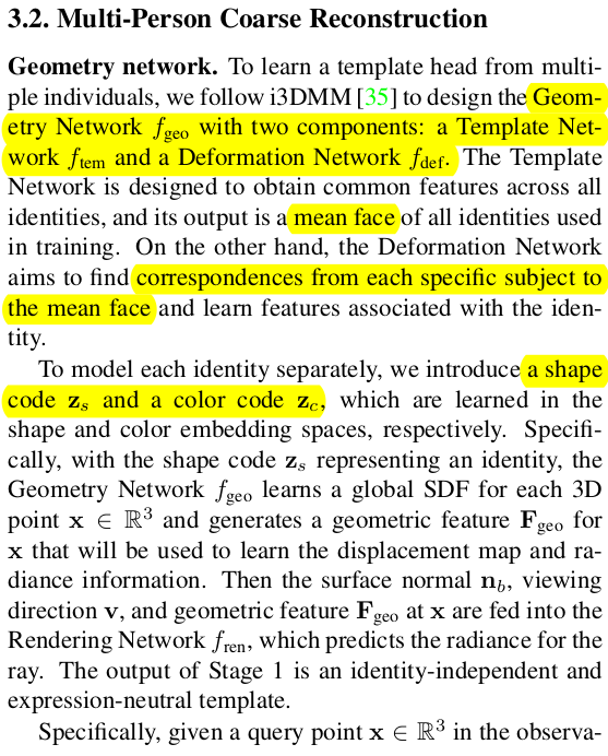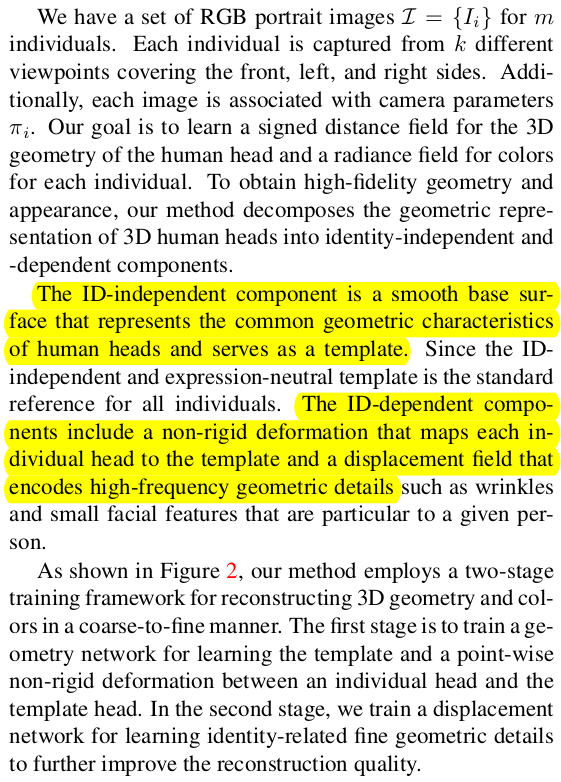 얼굴 한정 VolSDF 류 논문인데 3DMM을 동시에 활용함으로써 성능 향상과 필요 이미지 감소, 속도를 개선한 논문이다. SMPL 기반 clothed human modeling에서 자주 쓰이는 기법의 얼굴 버전이라는 생각이 든다. 3DMM 초기화를 이용해 coarse 복원 이후 model coverage를 벗어난 디테일을 보충하는 fine 복원 과정으로 구성되어 있다.