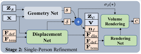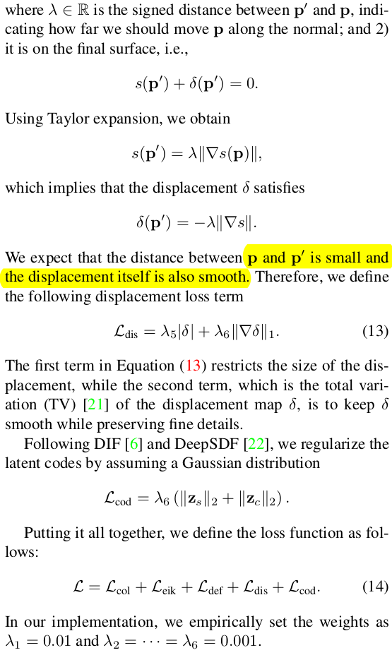 ![]() 역시나 deformation net으로는 부족해서 추가했다고 한다. 따라서 앞선 coarse 결과를 이어 받아 이번엔 한 사람만 타겟으로 복원을 한 번 더 한다. 구조는 이전과 거의 유사하며 deformation net 역할을 하던 녀석이 displacement net으로 변경되었고 xyz translation을 예측하는 것이 아니라 SDF residual을 예측하도록 설정되었다. 이렇게 학습을 돌리면 detail을 더 살린 복원을 할 수 있을 뿐더러 coarse 결과에서 시작하기 때문에 빠르다. SDF residual은 역시나 작아야 좋기 때문에 regularization이 들어간다. |