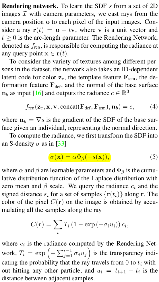 입력만 종류가 많아졌을 뿐 VolSDF의 rendering network와 완전 동일하다. |