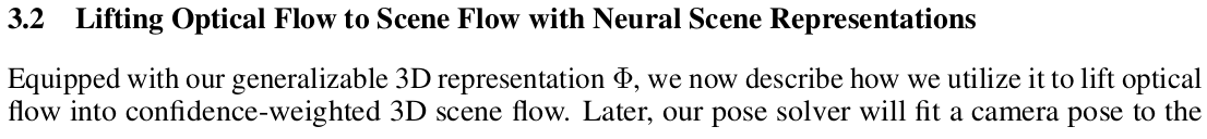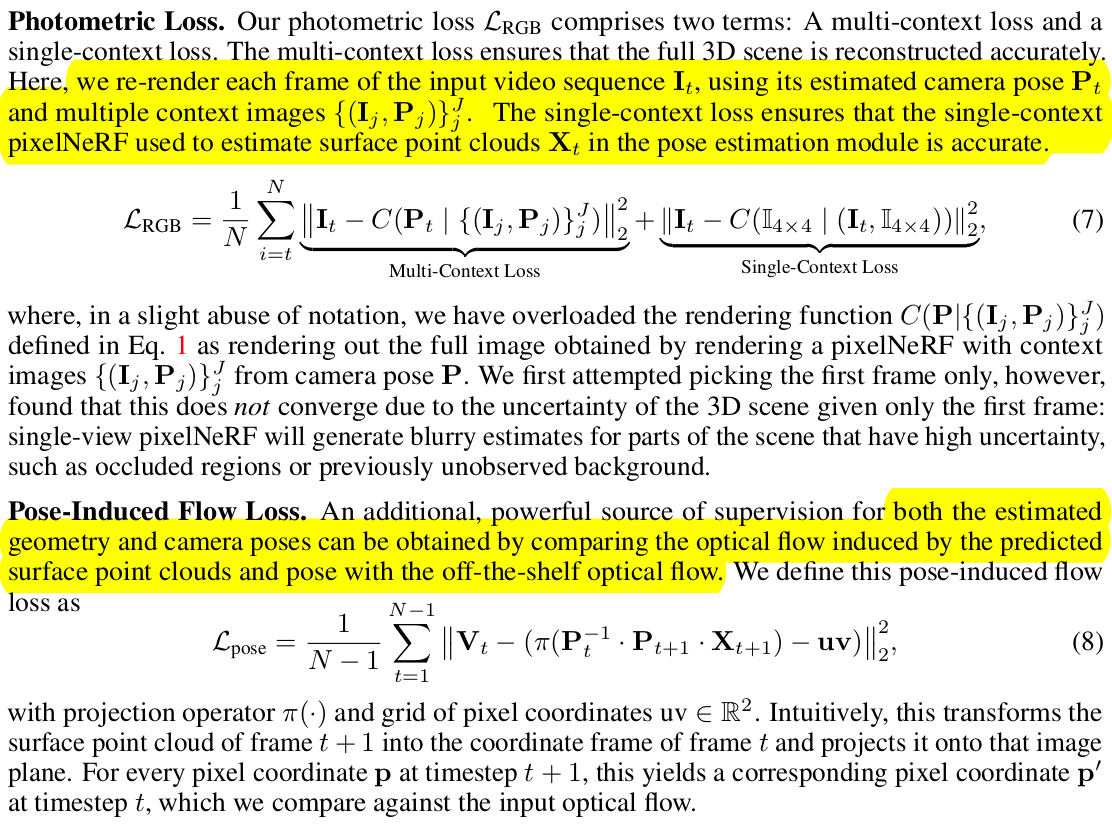 | 카메라 포즈를 찾는 내용이다. 일단 연속된 이미지 2장씩 묶어서 RAFT를 통과시켜 optical flow를 얻어낸다. 그리고 optical flow로 correspondence들을 생성한 뒤 해당하는 pixel들을 pixelNeRF를 통과시켜 3D로 올린다. 3D로 올리는 디테일은 Eq.2 보라고 하는데 ray 별로 sample point 여러개 만들고 pixelNeRF 태워서 전부 volume density 계산한 뒤, 적분해서 depth로 바꾸는 식일 것이다. 3D correspondence가 (정확성이야 어찌됐든) 얻어졌으면 상대적 rigid transformation을 푸는 것은 쉬운 문제가 된다. 뒤에 설명 더 나온다. 여기서 2D to 3D 디테일은, 2D correspondence를 믿고 쓰기가 조금 불안하긴 했는지 네트워크 하나 붙여서 correspondence에 대응되는 pixelNeRF feature를 보고 confidence를 추정하도록 해서 활용했다. (이게 맞나... 추정값으로 추정값을 구한다...?) 마지막 intrinsic은 FoV 계산해주는 네트워크 통과시켜서 FoV 값 얻고 focal length로 역계산해서 썼다. (불안하다...) |