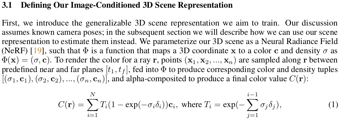 | 이제는 안 나오면 섭섭한 NeRF 설명으로 공간 한 번 싹 채워주고, 마지막 줄에 띡 pixelNeRF 이용한다고 적어뒀다. pixelNeRF는 이미지 별 feature를 뽑아주는 부분, feature to color, volume density로 올려주는 부분으로 나누어져있는 네트워크다. feature의 힘을 믿고 적은 이미지로 NeRF를 학습시킬 수 있다고 소개한 논문이다. |