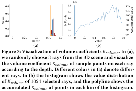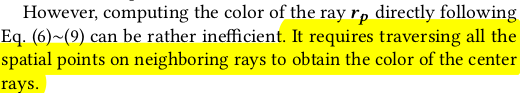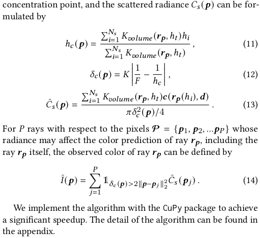 그런데 문제가 수식 (7) (8)을 그대로 사용하여 loss를 구현하기에는 연산량이 너무 많다는 것이다. (7)만 해도 각 위치 h_i마다 aperture diameter를 새로 계산해야하고 (8)은 (7)의 행위를 neighbor ray 개수만큼 반복한 뒤 또 적분해야 한다. 그래서 연산량을 줄이기 위해 관찰을 해보니, volume rendering에서 피사체의 빛을 결정하는 것은 형상 표면 근처 위주로 보면 된다는 것을 알 수 있다. 그림 (3)에서 표현한 것이 그 내용인데 ray 상의 무수히 많은 위치가 있지만 결국 특정 depth (표면 근처)에 몰려있다는 것을 알 수 있다. 따라서 전략을 세우길, 일단 표면 근처 위치만 보고 해당 위치들의 빛을 표면에 해당하는 h_i로 다 모으고, h_i에서 aperture diameter를 한 번만 계산한 뒤 모든 값을 h_i의 diameter로 흩뿌려준다. approximation하는 셈이다. 표면에서 먼 위치는 어차피 계산해본들 영향력이 없으니 말이다. 표면에 해당하는 h_i는 volume rendering에서 수식(10)과 같이 적분해서 간단히 얻을 수 있다. 모든 위치를 보아야하는 것은 표면 근처로 축소한 것 + 축소한 각 위치에서 diameter를 각각 계산해야되는 표면 위치로 퉁쳐서 한 번만 계산하는 것으로 연산을 줄인 것이다. |