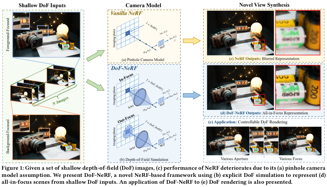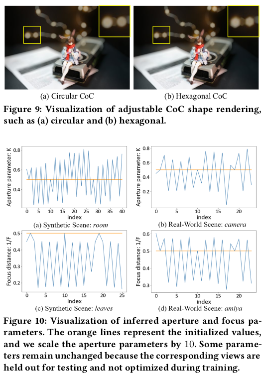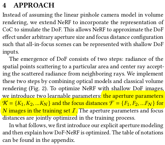 일단 시작은 각 이미지마다 DoF를 결정하는 aperture와 focus distance를 learnable parameter로 부여하는 것으로 시작한다. 학습 과정에서 이 두 파라미터가 학습될 경우, 이론 상 초점거리와 aperture를 바꾸어 가면서 다양한 DoF에 대한 이미지를 렌더링할 수 있게 된다. |