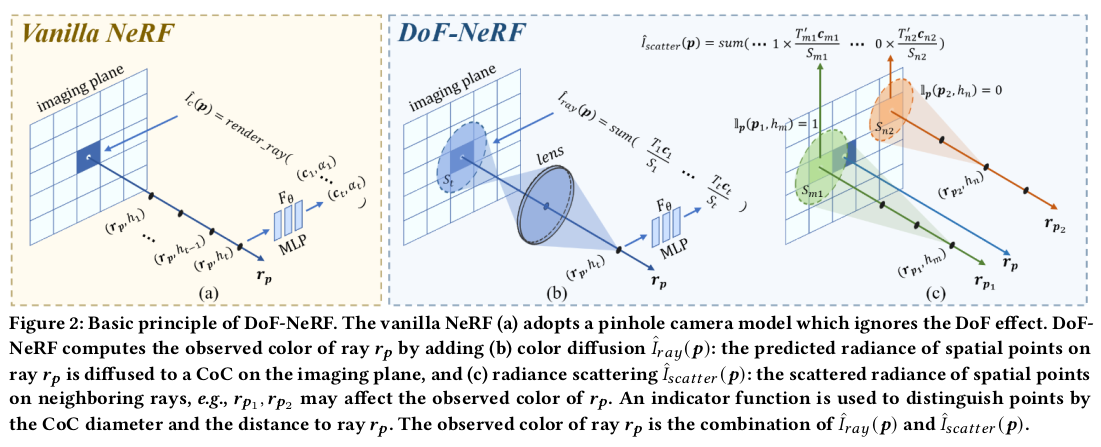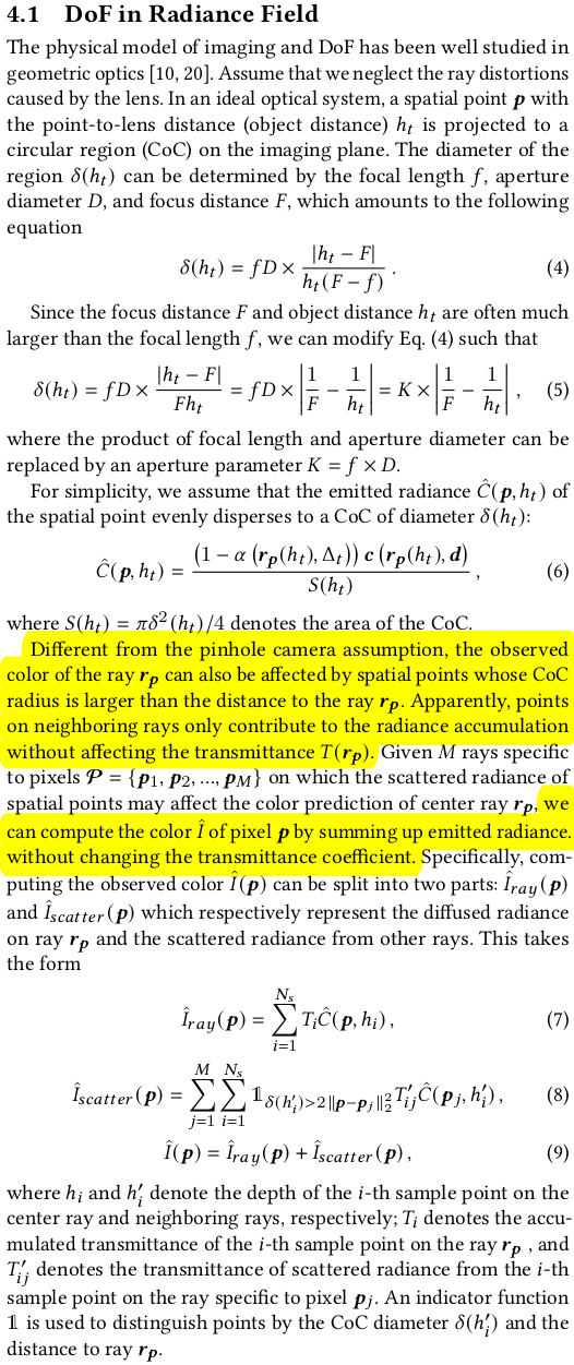 DoF를 NeRF에 학습시키기 위해서 2가지 개념을 사용한다. 1) (b)와 같이 한 pixel에 맺히는 빛은 ray의 여러 위치의 diffusion 값이 중첩된 값이다. 2) (c)와 같이 한 pixel에 맺히는 빛은 주변에서 넘어온 빛도 포함한다. 이 각각은 I_ray와 I_scatter로 나누어 모델링했다. --- 그 이론적 기반은 (4) (5) (6)과 같다. 요약하면 개념 1) 2)에서 빛이 퍼져나가거나 넘어오는 빛의 반경을 계산하는 방법인데 이는 렌즈까지의 거리, 초점거리, focal length로 계산할 수 있는 값이다. 퍼져나가는 빛의 세기는 CoC(circle of confusion) 안에서는 동일하다는 가정 하에 NeRF color 값과 엮어서 (6)과 같이 계산할 수 있다. CoC는 그림으로 보는 것이 편한데 아래 그림처럼 렌즈 굴절에 따라 빛이 한 픽셀에 안모아지는데 이 안모아지고 펼쳐지는 영역을 말한다. 이 영역이 넓을수록 이미지가 흐려진다. 초점이 나간다는 말. ![]() --- 이론적 기반을 이용해 개념 1) 2)를 수식으로 표현하면 (7) (8)과 같다. (7) 한 픽셀에 맺히는 값은 ray의 각 위치 h_i에서 각각 diffusion된 값의 합 (8) 한 픽셀에 맺힌 값은 주변 픽셀에서 넘어온 값의 합 (주변 픽셀은 각각 (7)로 계산이 되니까 이중적분이 필요함) |