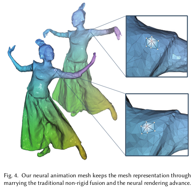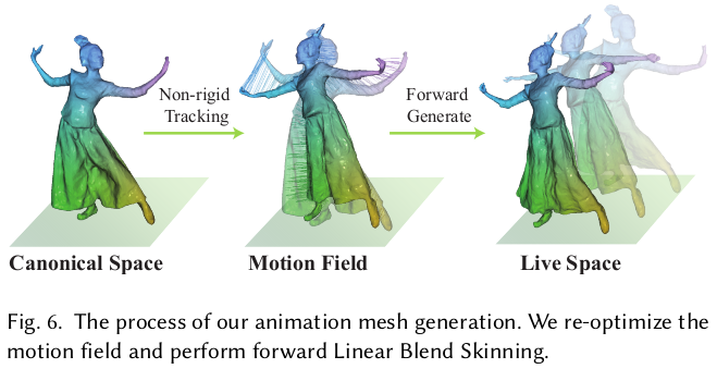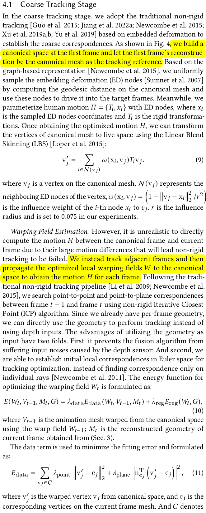 ![]() 기존 canonical space를 정의해서 쓰는 건 동일하며, 딥러닝 아니고 non-rigid tracking 최적화 기반 방법 그대로 썼음. 첫 프레임에서 복원하고 mesh화한 뒤, embedding deformation node를 지정함 (geodesic distance 따져서 고르게). 그리고 ED 마다 SE3를 추정한 뒤, LBS처럼 neighbor vertex까지 ED의 SE3로 transformation하여 error를 평가하는 식으로 최적화 첫 프레임만 고정적으로 사용하면 large motion에 대해 성능이 떨어지므로 첫 프레임 이후로는 인접 프레임을 사용함. 사용한 loss들은 수식(11) (12)와 같음. |
