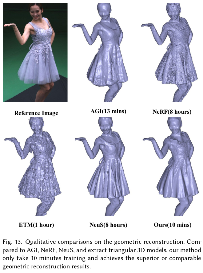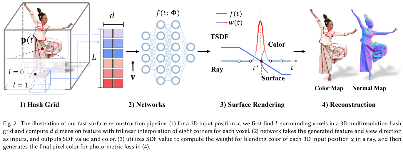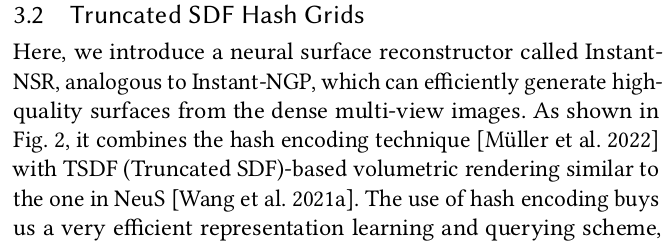 이 논문은 InstantNGP를 SDF based NeRF에 확장한 논문이다. 복원 대상을 사람으로 한정해서 non-rigid motion을 추가했다는 contribution이 있지만 핵심은 SDF base NeRF의 속도를 비약적으로 끌어올리는 것에 있다.