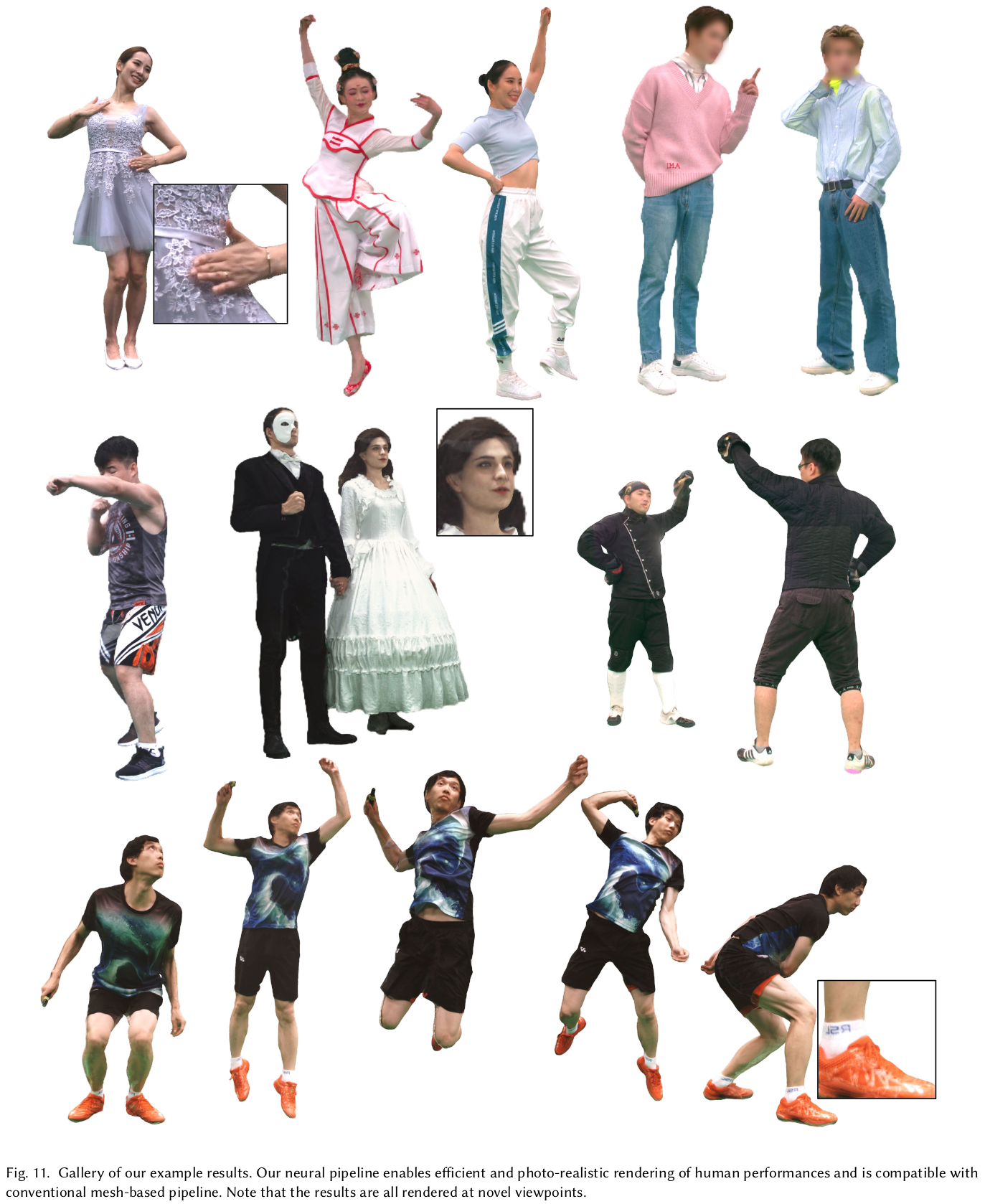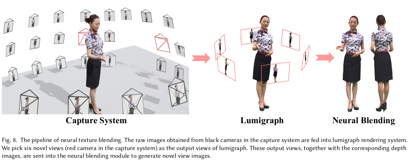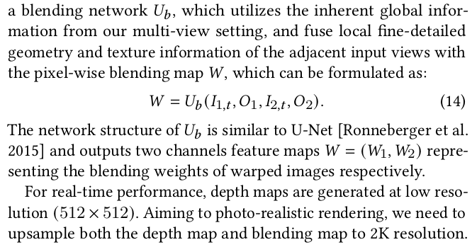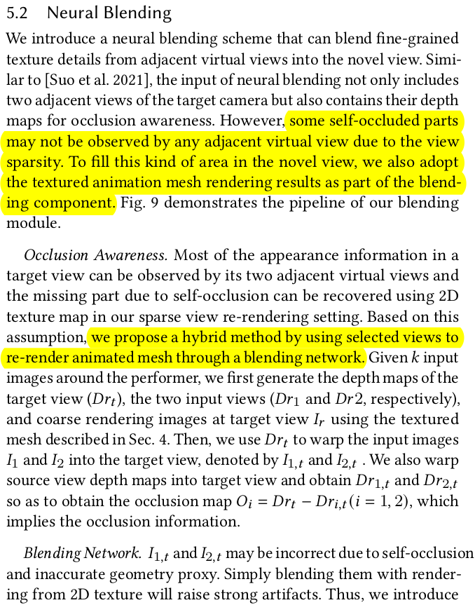 ![]() image based rendering이 미흡한 부분은 역시나 네트워크로 채웠다. 대표적으로 self occlued region이 시점을 6개만 써서 커버가 안될 때다. occlusion이 있다 없다는 일단 네트워크에게 알려줘야 하기 때문에 특정 시점에서 rgbd rendering을 하고 카메라 포즈를 이용해 warping 한다. 그리고 warped depth와 해당 시점 raw depth와 차이를 계산해서 occlusion score처러 쓴다. O color를 보정하는 네트워크, blending network는 각종 시점 rendering 결과와 occlusion score를 입력으로 받고 출력으로 타겟 시점의 color를 어떤 시점에서 얼만큼 가져와야 하는지 blending weight를 내뱉는다. 결과적으로 수식(15)와 같이 각종 시점에서 warped image를 weighted sum하면 현 타겟 시점의 color가 나오는 것. 여기서 입력이 되는 rgb rendering들은 위 image base rendering을 거친 결과들이다. |