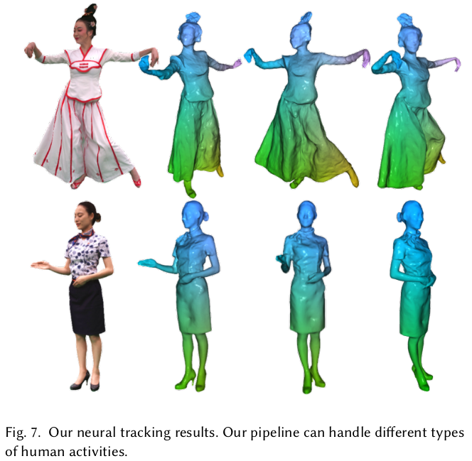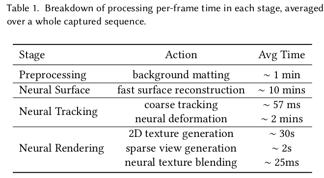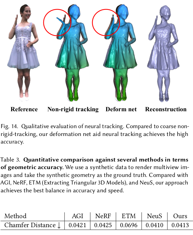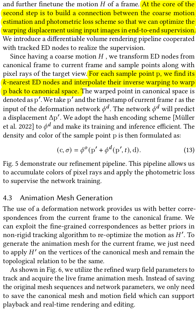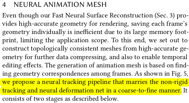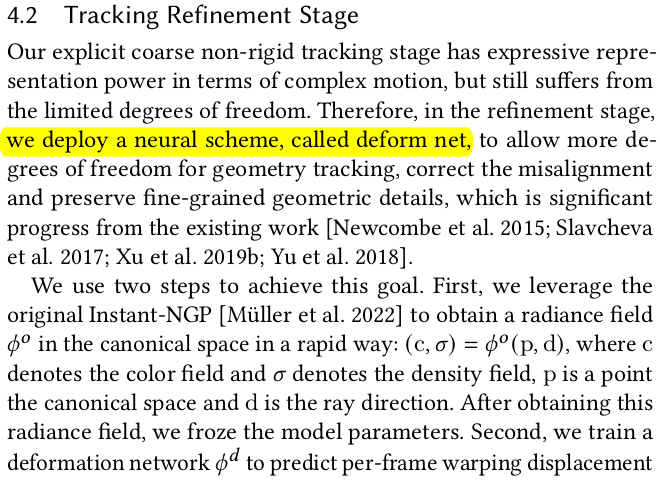 non rigid tracking 으로 완벽히 커버할 수 있는 건 network로 한 번 더 보정함. Vanilla NeRF를 InstantNGP로 빠르게 학습시키고 고정해둔 뒤, deformation network로 인해 최종 보정된 값을 던져주었을 때 color가 제대로 나오는지를 loss로 걸어주는 식으로 학습을 시킨다. (NeRF를 학습시켜두는 시간도 포함되기 때문에 결국 세가지 네트워크를 쓰는셈이 된다. SDF NeRF, deformation, NeRF) ![]() ![]() |