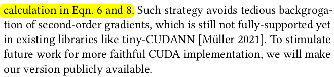 ![]() 길고 길게 써있지만 Hash grid를 이용한 SDF 학습을 위해 2nd order derivative 계산 방법을 CUDA로 직접 구현했다는 이야기. 부수적으로 구현을 했더니 SDF는 학습 안정성이 떨어져서 sigmoid를 씌워서 TSDF로 사용했다. 2nd order derivate가 핵심인데 이건 설명보다 구현적인 것이라 논문에 기재되어 있지 않음. 근데 이걸 빼고는 논문 내용이 부족하지 non-rigid 파트를 추가하고 집중 설명한 듯. |