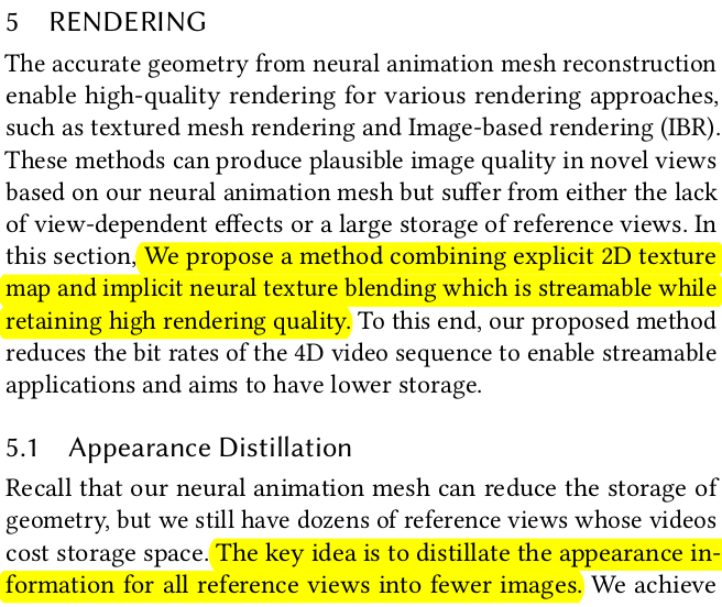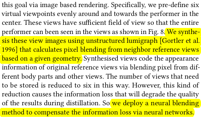 rendering할 때 color를 SDF NeRF에서 나오는 color를 써도 되지만 이럴 경우 색깔 저장해야되는 양이 너무 많기 때문에 효율이 떨어진다. 이를 효율적으로 풀고 퀄리티도 올리고자 image based rendering을 쓴다. occlusion 문제가 없도록 고른 방향에서 6시점 이미지를 생성해두고 geometry를 가지고 어디서 어떤 pixel의 색깔을 뗘와야하는지 계산해서 채우는 식이다. 이럴 경우, 이미지 6장만 저장하면 된다. |