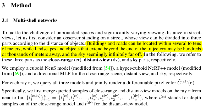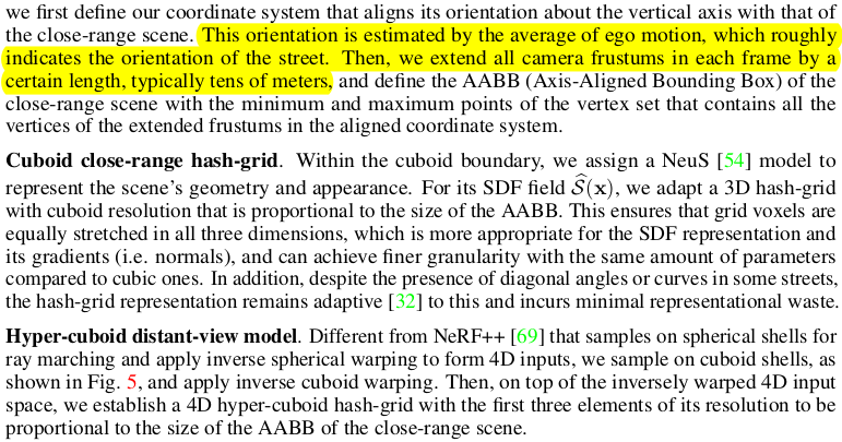 | 근-중거리의 cuboid를 어떻게 잡느냐는 설명인데, 거리뷰 시퀀스마다 카메라 위치가 지나간 공간 전부를 둘러싸는 cuboid를 근거리, 그 외를 중거리로 보았다. 즉 촬영 차량이 지나간 경로 인근은 근거리 복원 대상으로 보고, 촬영 차량이 지나가진 않았지만 관측된 영역은 중거리 복원 대상으로 본 것이다. cuboid의 사이즈는 frusturm을 고려해서 잡았고 중거리는 inverse-cuboid warping으로 그 때 그 때 중거리용 AABB를 잡아 hash grid 생성해서 연산했다. |