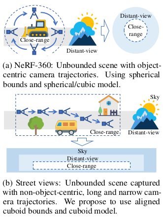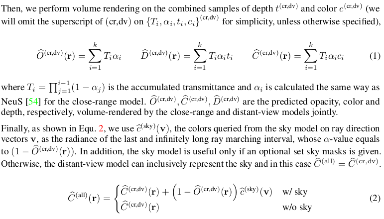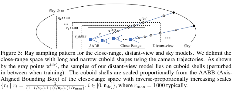 | 이름은 복잡하지만 근-중-장거리가 개념상 나뉘어져있단 소리다. 구현적으로는 그냥 근중 - 장거리 로 나뉜 느낌이다. 일단 ray 별로 근-중거리를 합쳐서 sampling하고 rendering한다. 장거리는 선택적으로 사용되는데 sky mask가 있을 때만 추가된다. 즉 sky segmentation 없으면 근-중거리만 있다. ![]() 근-중거리를 개념 상 나눴다고 했는데 앞선 rendering 과정처럼 그냥 concat 하고 통째로 rendering하면 실제로 구분력은 없다. 수식 상으로 구분력이 주어지는 것이 아닌 듯 하다. 구현적으로 figure 5와 같이 근거리는 항상 고정적으로 cuboid를 잡고, 중거리는 sampling에 따라 dynamic하게 잡히도록 해서 근거리는 항상 자세하게, 중거리는 두루두루 보도록 설계를 해서 구분력을 부여한 것 같다. |