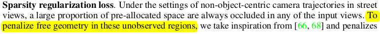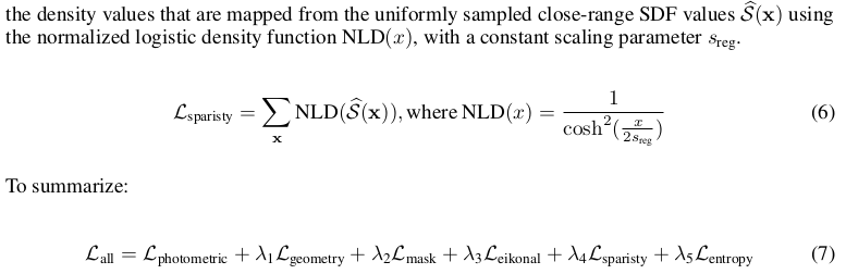 | 사용된 loss 전부다. (논문 구조가 좀 이상한게, 중간 중간 loss 설명도 하고 정작 후반에서는 앞에 설명했음 ㅋ 이러는 구조) color loss 당연히 사용하는데 수식은 NeuS를 따른다. 최종 형태는 L1으로 했을 때 제일 좋았다고 한다. Geometric loss는 선택적으로 LiDAR를 사용할 수 있을 때와 없을 때를 나뉘어서 전자는 LiDAR와 rendered depth를 직접 비교하는 loss, 후자는 monoSDF에서 쓴 것처럼 다른 SOTA normal, depth network에서 나온 pseudo GT와 비교하는 loss다. 마지막 sparsity regularization loss는 거리뷰가 시점이 워낙 단조롭다 보니까 cuboid 내에 한 번도 촬영이 안된 부분이나 몇번 촬영이 안된 부분이 있을텐데 이 영역에서 noise가 생기는 것을 방지하는 loss다. entropy regularization loss와 거의 같은 목적으로 추가된 loss. |