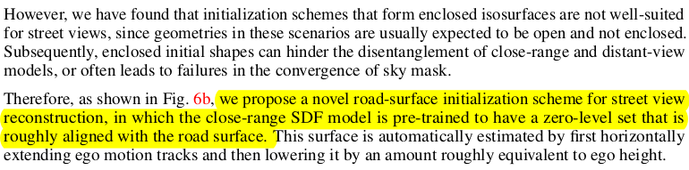 | object centric이면 SDF network 초기화를 sphere 형태로 하면 되는데 거리뷰는 sphere나 elipsoid로 하면 망한다. 그래서 다른 방식으로 바닥면을 일단 초기화해주었다고 한다. 거리뷰기 때문에 도로 위치를 카메라 위치로 역계산해서 초기화해주는 것인데 효과적일 것 같다. |