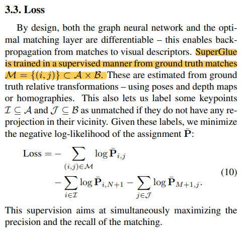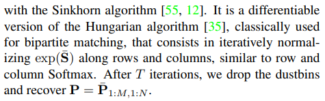 matching feature로 전부 계산이 완료되면 soft assignment matrix P를 계산하는 과정이다. 먼저 mathicng feature 간의 score matrix를 구하는 것을 먼저 한다. 대부분의 알고리즘들은 여기서 끝. score는 내적(cosine similarity)로 정의해서 계산하면 되고 특이점은 M x N matrix가 나올텐데 마지막 row, 마지막 column을 dust row, clumn으로 추가해주는 것이다. superpoint에서 dustbin을 추가해주는 것과 비슷한데 매칭이 없을 수 있음을 더욱 분명하게 만들어주기 위해서 일종의 helper row, column이다. 설령 similairty가 0이 아니더라도 이 dust row와 dust column이 0일시 무시하는 식으로 구현할 수 있어서 오매칭에 효과적일 것으로 보인다. |