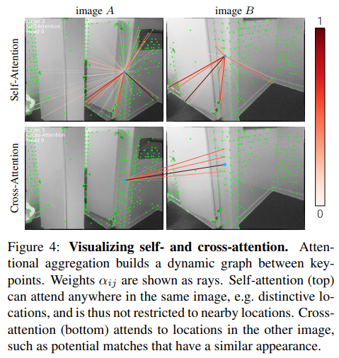 encoded keypoint + descriptor 를 받아 처리하는 GNN은 transformer에서 빌려와서 self-attention과 cross-attention으로 처리된다. self-attention은 같은 이미지에 있는 feature끼리 연산되고, cross-attention은 다른 이미지 간에 있는 feature 끼리 연산된다. edge 형성은 아직 이웃한 관계를 정의할 수 없기 때문에 전부 연결되어있는 fully connected graph라고 볼 수 있겠다. 학습은 self 한 번 cross 한 번으로 진행된다 여기서 keypoint 개수가 매번 다르기 때문에 sum, concat 등의 방식으로는 모든 연결 관계에서 오는 feature들을 입력으로 삼을 수 없으므로 aggregation 해서 사용한다. 뒤에 나옴. |