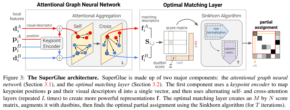 두 이미지에 존재하는 keypoint + descriptor를 입력으로 받는 attentional GNN, 그 결과로 나오는 mathicng descriptor를 받아 최종 matirx P를 출력하는 optimal matching layer로 구성되어 있다. 전자는 학습 기반이고 후자는 sinkhorn 이라는 알고리즘을 differentiable 하게 만든 것 기반이다. |