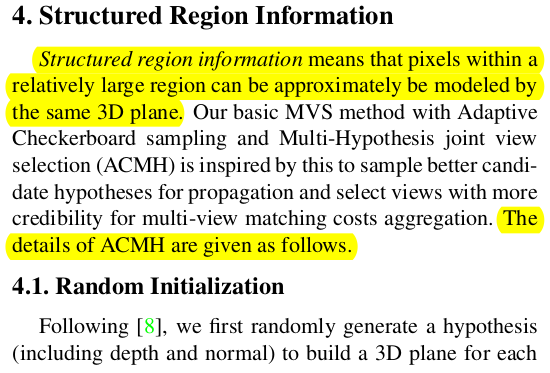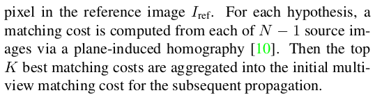 먼저 ACMH를 설명하기 시작한다. ACMH는 기존 patchmach stereo와 크게 다르지 않다. 무작위로 depth, normal 초기화하는 것도 같고 cost aggregation하는 부분도 top K 뽑아서 하는 것도 동일하다. |