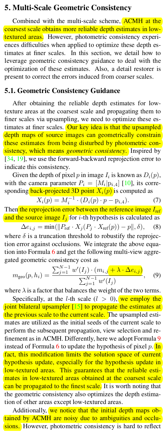 ACMH가 끝났다. 이후엔 ACMH with geometric consistency다. 똑같은데 cost function에 geometric consistency를 추가해서 한 번 더 돌려준다. gc(geometric consistency)라 함은, 현재 찾은 depth를 이용해 back projection 후 다른 시점으로 reprojection했을 때 맞아 떨어지는지 평가하는 것이다. 정확하다면 reprojection error가 작게 나와야 하니 말이다. 이런 reprojection error를 matching cost(photometric consistency)에 더해서 수식(9)와 같이 cost function을 변경해서 다시 한 번 돌려준다. 이런 방식은 photometric consistency가 잘 안통하는 textureless region에 대해 upsampled depth의 힘을 받아 성능을 끌어올릴 수 있는 방식이기 때문에 textureless region 성능이 좋아질 뿐만 아니라 사실 모든 위치에서 적용 가능한 수식이라 전반적으로 성능이 높아진다고 한다. |