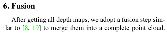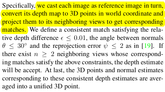 all depthmaps to one point cloud 작업은 이전 work들과 동일하다 reference 잡고 back projected 3d point 만든 뒤, 하나하나 다른 시점으로 내려찍어보면서 geometric consistency를 체크해서 지우고 남기는 작업을 반복하면 된다. |