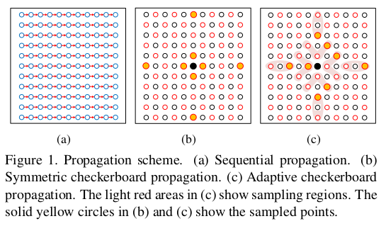| 기존 Wp neighbor를 정의하는 방식을 (b)와 같이 써왔는데 이를 (c)와 같이 구역으로 한정하고 그 구역 내부에서 sampling은 현 cost 상태를 보고 가장 낮은 cost sample을 고르도록 변경함 | textureless region도 조금 멀리서 보면 경계가 보이는 일이 다분하기 때문에 patch size를 고정하고 multi scale로 같은 위치를 관찰하면 texture-less region이라고 정보가 없진 않다는 전제 |