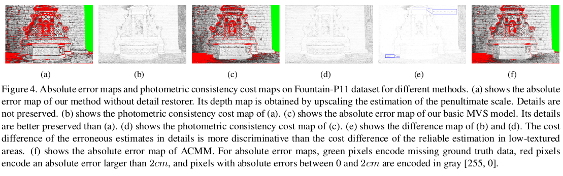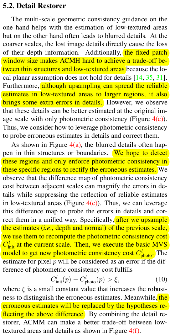 detail restorer는 multi scale의 장점을 이용해 detail을 더 살리는 방법이다. upsampling을 통해 coarse 정보를 가져오면 일단 error가 큰 상태일 뿐만 아니라 과도하게 넓은 fine 영역에 coarse 정보가 덮힌다. 그래서 error를 줄이고 영역을 fine scale에 맞도록 재단해줄 필요가 있다. 이 방식은 upsampled vs fine scale(ACMH w gc까지 돈 것)을 비교해서 차이가 큰 영역을 masking하고 그 masked region에 한 해서 수식(10)을 최소화 하도록 한 번 더 돌려주는 것을 의미한다. |