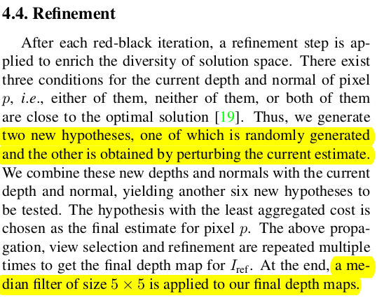 수식(6)과 같이 정의한 cost function으로 최적화를 돌리면 일단 ACMH가 끝나는데 결과값을 refinement하는 스텝이 남아있다. 여기선 추정된 depth와 normal이 둘다 부정확, 둘다 정확, 둘 중 하나만 정확 이라는 3가지 케이스가 존재하는데 여기에 randomize, pertubation이라는 2가지 경우의 수를 더하여 총 6가지 augmentation을 한 뒤, 우연히 cost가 더 낮아지는 결과가 있다면 업데이트하는 식으로 했다. depth만, normal만, depth+normal 둘 다 random or pertube하는 것이다. 마지막엔 media filtering 적용한다. |