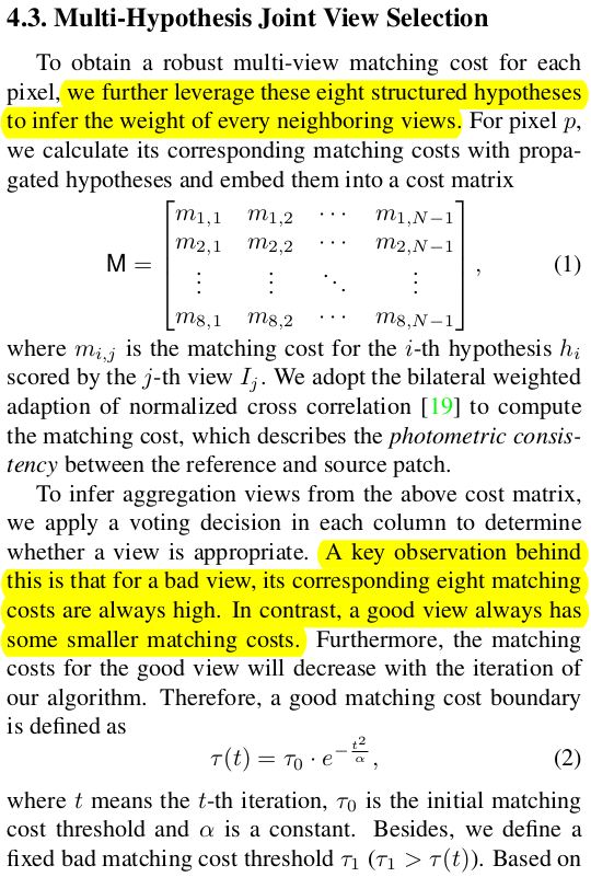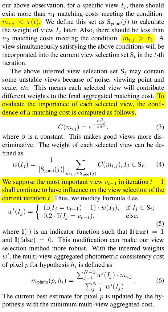 view selection도 기존에 전후 N개로 단순하게 선별하거나 무작위로 선별했다면 matching cost를 기반으로 view를 scoring해서 선별하는 방식으로 바꾸었다. 수식(1)과 같이 앞서 만든 8개의 hypothese x N-1 개 view 간의 cost를 matrix로 만든 뒤, 가장 낮은 total cost를 갖는 column(view)에 우선순위를 부여하는 방식이다. 전제 조건은 matching cost가 전반적으로 낮게 나오게 만드는 view가 좋다라는 가정이다. total cost의 일정 threhold를 부여해서 total cost가 일정 범위 안으로 들어오는 애들만 view cadidate가 될 수 있도록 했고 각 view마다 total cost로 만든 weight를 부여해서 (수식3) cost aggregation도 단순 sum이 아니라 weighted sum (수식4)로 변경했다. total cost threshold는 heuristic한 값인데다가 학습 초기에는 높고 후반에는 낮아져야 되는 특성이 있기 때문에 threshold는 초기값만 잡아주고 이후에는 자동 deacy한다 (수식2) (초기값 잘못잡아서 전부 다 out되면 어떻게 되는지 궁금해서 코드를 보니 전부 다 out 될 경우 그냥 top n개를 사용하도록 해뒀더라) ------- 수식(4)로도 충분해 보이지만 연산을 매번하는 것도 문제고 사실 이전 step에서 best view로 뽑혔던 것이 이번 step에서 worst view로 뽑힐 확률은 매우 낮기 때문에 이전 step에서 뽑힌 view들에 가중치를 주는 방식으로 약간 변형해서 수식(5)로 만들어 사용했다. |