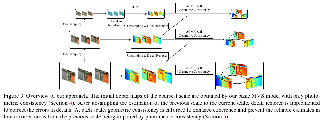 위 그림이 전체 파이프라인인데, 보다시피 ACMH가 기본 단위이고 이를 multi scale로 여러 번 upsampling하면서 적용하는 구조다. 따라서 ACMH와 ACMH의 cost function에 geometric consistency를 추가한 버전 2개를 이해하는 것이 시발점이다. multi scale로 구현한 이유는 앞서 짧게 언급한 바와 같이 texture less region도 patch size를 고정한 채 멀리서 보면 경계가 보일 확률이 높으므로 coarse에서 관찰할 수록 texture less에 유리, fine에서 관찰할수록 detail에 유리하기 때문이다. |