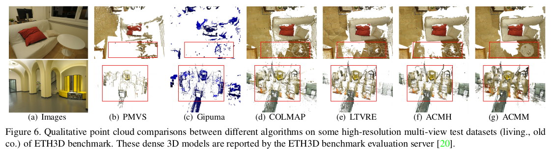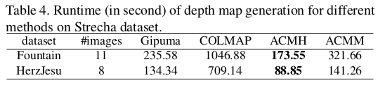 이 논문은 MVS 논문인데 이전에 간단히 기록했던 2015년 patchmatch stereo 기반 MVS 논문 [link] 의 확장판으로 2019년 비교적 최근에 등장한 논문이다. 주목할만한 점은 딥러닝이 판을 치기 시작한지 한참 지난 시간임에도 딥러닝 하나 없이 훌륭한 성능을 달성한 것이다. 기본에 충실하게 logic을 검토하면서 MVS 파이프라인을 구현한게 존경할 만하다. 코드가 방대한 양이 아니라 고작 h, cpp 2쌍으로 끝나도록 간결하게 구현했는데 성능이 좋은 것도 주목할 만 하다.