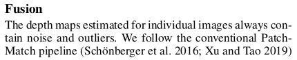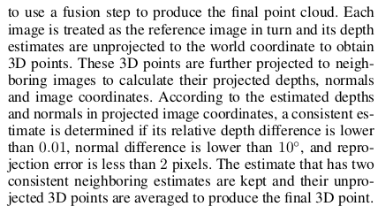 refinement, geometric consistency, fusion은 ACMM과 동일하다. depth, normal에 random혹은 pertube augmentation을 가하고 우연히 cost가 줄어들면 업데이트하는 방식. reprojection error를 matching cost에 추가해서 사용하는 방식이다. reprojection error평가하면서 단일 pcd화하는 것. |