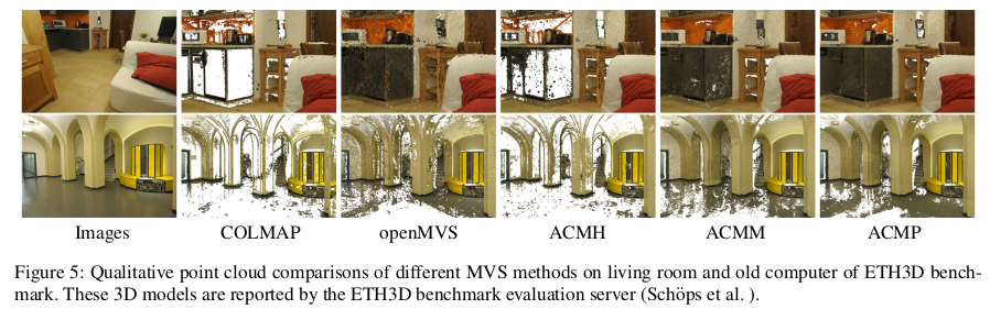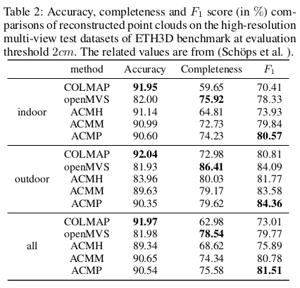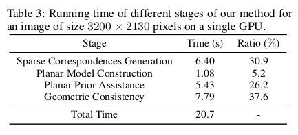 이걸 이용해서 비어있던 공간이 완벽하게 채워지고 그런 것은 아니지만 적어도 ACMM으로 값이 채워진 영역 부근에서는 이러한 planar prior를 이용해 조금 더 채워지는 현상이 있을 것이다. 혹시 모든 형상을 평면으로 가정해버리면 오히려 ACMM 결과가 망가질 수 있지 않느냐고 지적할 수 있는데 2d triangulation 특성 상 dense pose 주변에는 작은 삼각형이 여러개 형성되기 때문에 충분히 작은 평면이므로 어느 정도 커버된다고 한다. texture-less region이 큰 삼각형으로 처리되는 것이 더 큰 메리트.