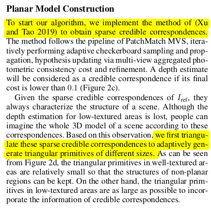 핵심 아이디어는 다음과 같다. ACMM을 돌리면 textureless region을 제외한 웬만한 영역에서 3d point가 잘 나와주는데 이걸 reprojection에서 이미지에 내려찍은 뒤, anchor처럼 이용하여 2d triangulation을 한다. 그리고 가정하길, 2d triangulation으로 얻어진 삼각형 하나하나는 평면으로 간주되다는 것이다. 이러한 가정을 cost function에 추가해서 다시 한 번 최적화를 돌려주는 것이다.