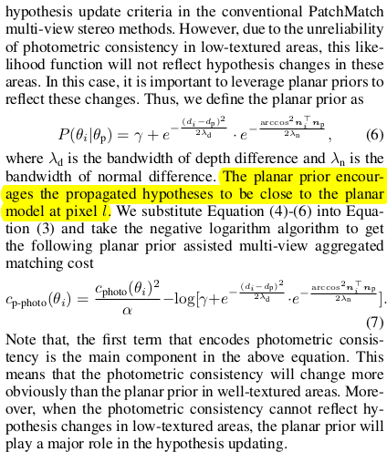 hypothesis 중 planar prior가 가장 잘 맞는 것을 고르는 로직(확률)은 수식(6)과 같이 정의했다. hypothesis의 depth, normal이 현 pixel의 depth, normal과 가까운지 계산한 값이다. 이걸 수식(4)에 넣어주면 되는데 log를 취해 수식(7)과 같이 변형된 것이다. ----- planar prior가 안 맞다면, photo consistency로만 업데이트될 것이고, photo consistency가 큰 변화가 없다면 planar prior로만 업데이트 될 것이다. |