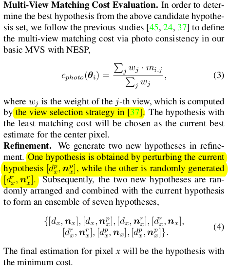 view selection과 refinement 스텝은 ACMM을 철저히 따른다. 수식(1)에서 만든 matrix를 이용해 top k view를 고르는 방식과 random/pertubed hypothesis들을 고의로 생성해 보정하는 방식 그대로다. |