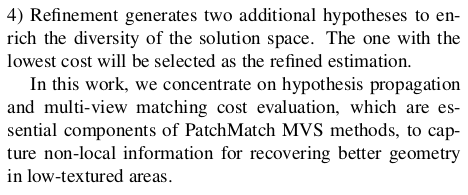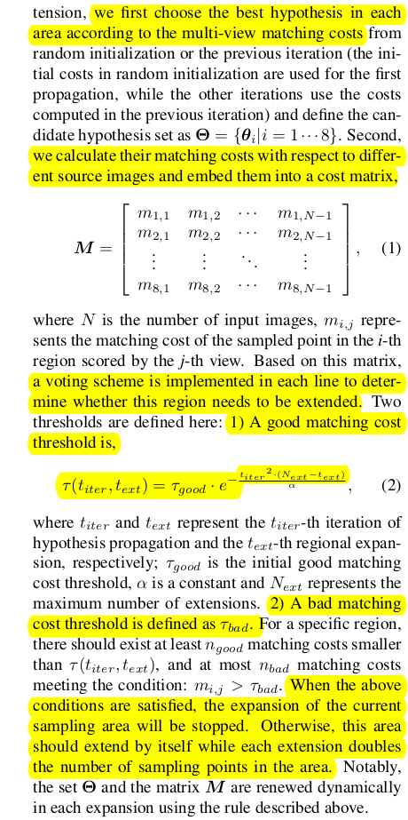 각 영역 내 sampling하는 방식은 ACMP와 유사하게 시작한다. 일단 수식(1)과 같이 현 상태에서 가장 좋은 sampling을 영역 별로 뽑아 총 hypothesis 8개를 갖고 multiview cost를 계산해서 matrix를 만든다. 그 다음 각 hypothesis 별로 cost threshold 를 안으로 들어오는 good matching cost 개수를 센다. 만약 수가 적정 개수 밑이라면 미달 hypothesis가 속한 영역에서 2배수 hypothesis를 다시 생성해서 위 행위를 반복한다. (여기서 헷갈릴 수 있는 점이 초기에 matching cost 최소가 되는 hypothesis를 골랐는데 다시 뽑는다 한들 이보다 좋을 수 있는지 의문스러울 수 있다. 하지만 matching cost sum으로 본 것이랑 matching cost threshold 안에 들어오는 view가 많은 것이랑은 완전 1대1 대응이 아니므로 다시 뽑는게 의미가 있다. 특히 local minima일 경우!) 행위를 반복할 때마다 정확한 hypothesis가 등장해야 한다는 전제하여 수식(2)와 같이 matching cost threshold는 갈수록 타이트해진다. 결과적으로 8개의 hypothesis로 시작했지만 나중에는 영역 별로 Ni 개 씩 생성될 수 있어 훨씬 많은 hypothesis가 참여하게 된다. |